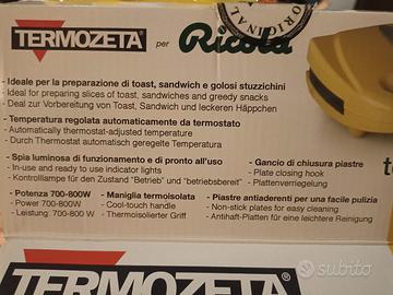 Tostiera con marchio Ricola, nuova, in imballo originale, usata poco ( 2-3 volte). Compatta dal design semplice e funzionale, ideale per la preparazione di toast, sandwich e golosi stuzzichini.