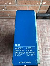 Contiene un piccolo scalda acqua, un mini ferro da stiro, un mini asciugacapelli e un rasoio elettrico. Tutti hanno la doppia presa americana.
