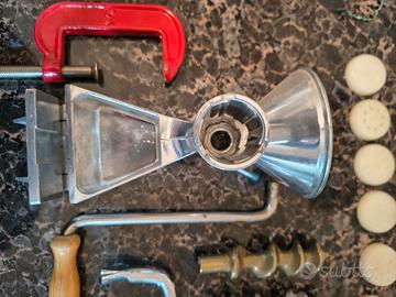 Tritacarne e Profila per pasta in metallo, marchio sconosciuto, in ottime condizioni. Vendo completo dei suoi accessori come in foto. Le viti senza fine interne sono 2, la ghiera di chiusura frontale è nuova. 3 accessori in metallo per tritacarne e 8 in plastica per fare la pasta trafilata in vari formati. 2 morsi per tenerlo fermo, 1 sicuramente successivo (rosso) compreso.