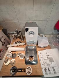Comprato alla Lidl per fare gli hamburger in casa e come capita spesso la usi una volta e poi finisce in cantina. E' in perfette condizioni e fornita di tutti gli accessori, compreso quello per fare la salsa di pomodoro, le salsicce, le kubbe e per la pasticceria. Vendo per inutilizzo. I dischi del tritacarne si sono macchiati dopo lavaggio. 350 watt.