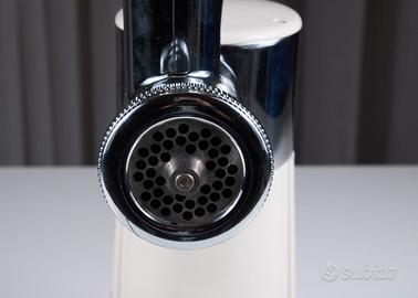 Il corpo in plastica bianca con gruppo macinazione in metallo riflette il design pratico degli anni ’70, pensato per l’uso quotidiano in cucina. Il tritacarne permette di lavorare carne in modo rapido e uniforme, ed è uno di quegli elettrodomestici solidi che hanno accompagnato le cucine italiane per decenni.