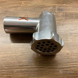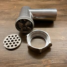 Tritacarne in acciaio inox di alta qualità, compatibile con i principali modelli di impastatrici. Il kit è completo di ogni parte: corpo macchina, vassoio superiore con coperchio, coltello a croce, tre dischi per diversi tipi di macinatura (ancora imballati), pressino e chiave per lo smontaggio. L'oggetto è in condizioni pari al nuovo, estremamente robusto e facile da pulire. Utilizzato con Planetaria Kenwood kMix KMX750