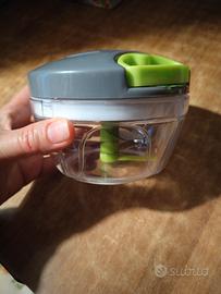 tritatutto a cordicella in plastica nuovo mai usato. trasparente, grigio e dettagli verde