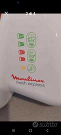 Tritatutto elettrico Moulinex Fresh Express multifunzione, 5 coni colorati per tagli diversi, affetta e grattugia diversi tipi di alimenti, verdura, frutta, formaggio, cioccolato, frutta secca, ecc. Potenza 220 w, modello compatto, colore bianco e rosso satinato, vano porta cavo, piedini antiscivolo, condizioni perfette, pari al nuovo, perfettamente funzionante