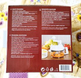 Tritatutto multiuso per mixare, mescolare, tritare e centrifugare. Pratica manovella e comoda impugnatura. Fondo antiscivolo che garantisce maggiore stabilità. Con beccuccio versatore, separatore del tuorlo d'uovo, centrifuga per l'insalata e coltello per tagliare. Capacità circa 1 litro. Adatto al lavaggio in lavastoviglie. In plastica con inserto per coltelli in acciaio inox. Istruzioni per l'uso incluse. Nuovo con scatola