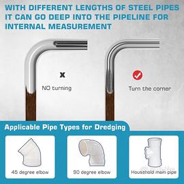 COCLEA DI PULIZIA FLESSIBILE DA 7,6 M: la spirale dello scovolino è dotata di una coclea di pulizia integrata che può essere estesa fino a 7,6 metri, in modo da poter pulire sia gli scarichi profondi che quelli poco profondi. L'asta per la pulizia dei tubi con un diametro di 9 mm e una testa di perforazione da 13 mm all'estremità è adatta per diametri di tubi da 20 a 85 mm. Allo stesso tempo, la spirale flessibile può pulire anche i tubi “S” e “L”.