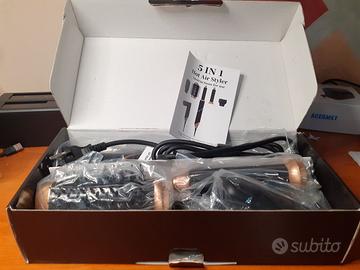 endo UKLISS 5 in 1 Hot Air Styler, spazzola asciugacapelli multifunzione per asciugare, volumizzare, lisciare e arricciare i capelli con un unico strumento. Utilizzata una sola volta, condizioni pari al nuovo, completa di scatola originale, manuale e tutti gli accessori. La vendiamo perché mia moglie utilizza il modello superiore con spazzola rotante automatica. Importante: questo NON è un modello rotante automatico, la spazzola NON ruota da sola per sagomare i boccoli, che vanno creati manualmente come con un normale ferro arricciacapelli. L’unico movimento riguarda l’impugnatura che può passare da dritta a 90° tipo phon. Spazzola ad aria calda volumizzante, più livelli di aria e temperatura, accessori intercambiabili, set completo 5 in 1 per uso domestico. Confezione originale completa.