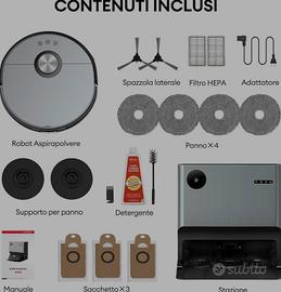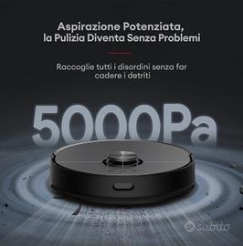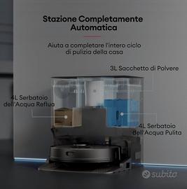 IDEA REGALO Il robot si vende nuovo, mai usato, perfettamente funzionante, ma senza garanzia in quanto ricevuto per regalo. Prezzo di listino di €659 Robot Aspirapolvere Lavapavimenti con Stazione Autosvuotante, Autopulente, Autoasciugatura, Navigazione LiDAR, Panni di Lavaggio Doppio, 5000Pa, 200 Min, WiFi/APP/Alexa/Siri/IFTT Stazione Completamente Automatizzata: La stazione dell'Aspirapolvere robot MC1 non solo è dotata di raccolta automatica della polvere e di ricarica automatica, ma anche di pulizia e asciugatura automatica dei panni, così per una volta sarete completamente liberi dal contatto con le macchie. Parametri di Fascia Alta del Settore: Il robot aspirapolvere MC1 ha una potenza di aspirazione fino a 5.000 PA e un'autonomia fino a 200 minuti, mentre la stazione ha un sacchetto per la polvere da 3L e i serbatoi dell'acqua da 4L+4L. Funzioni Estreme: L'MC1 è dotato della più avanzata navigazione LDS, scansione a 360°, 8 metri di distanza di mappatura, 2160 campioni al secondo per fornire la più accurata e veloce costruzione di mappe. L'MC1 è inoltre dotato di 4 serie di sensori anticaduta, sensori di rilevamento dei tappeti a ultrasuoni e sensori delle pareti per garantire una pulizia più precisa e senza interruzioni. Pulizia Perfetta: Il doppio panno rotante del robot aspirapolvere lavapavimenti MC1 ruota 180 volte al minuto e genera una pressione di 6N sul pavimento per pulire le macchie più ostinate. La stazione pulisce i panni in 60 secondi e si può anche impostare un intervallo di tempo personalizzato per la pulizia dei panni. La stazione offre anche l'asciugatura ad aria calda e si può scegliere tra asciugatura rapida (2 ore) o silenziosa (4 ore). App Intelligente: Con "Ultenic" App è possibile salvare più planimetrie, impostare pareti virtuali, selezionare le stanze da pulire e programmare gli appuntamenti di pulizia. È inoltre possibile collegare l'MC1 agli assistenti vocali di Google e Amazon per un controllo vocale semplice e comodo.