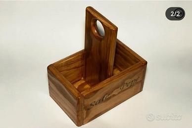 Cassettina Portasale portapepe saliera e pepiera con manico, realizzato a mano in legno di abete, color castagno e finitura lucida.
