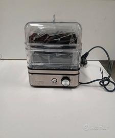 Utilizzabile come cuociuova per fino a otto uova o come vaporiera. Controllo elettronico del tempo di cottura, indicatore di funzionamento a LED. Coperchio in plastica trasparente + inserto per cottura a vapore. Segnale acustico alla fine del tempo di cottura