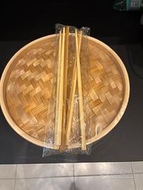 Cestello per Cottura a Vapore con 2 Piani e Coperchio – Cestello Bambù 25cm – Vaporiera Bambu, Pentola per Cottura Vapore con 2 Paia Bacchette, 1 Pinza, 50 Fogli di Cera – BlauKe®