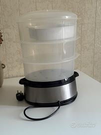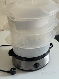 Potenza: 800 Watt Capacità: 9 litri Segnale acustico a fine cottura Timer di 60 minuti con auto-spegnimento Tre vaschette con diametro di 24 cm, 25 cm e 26