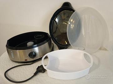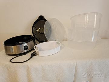 Vaporiera per cuocere il cibo al vapore, conservando la massima quantità di nutrienti e vitamine. Completa di tutti gli accessori e scatola originale: tre cestelli per cuocere contemporaneamente cibi diversi.