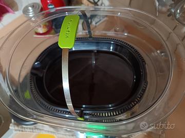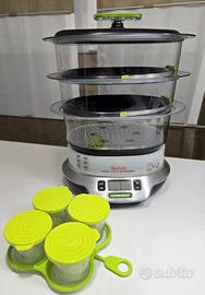 Funzione vitamin +: funzione di cottura veloce per preservare le vitamine 3 recipienti: un pasto di 3 portate preparato in una volta sola, senza mescolare i liquidi 2 vassoi per cuocere nella salsa 4 ciotole in vetro per cucinare in maggior quantità Sistemazione ultra-compatta brevettata per trovare spazio in ogni cucina. Usata poche volte. Completa di istruzioni e ricette Display digitale con timer Funzione mantenimento in caldo automatica Potenza: 1800w