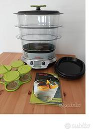 Vaporiera vitacusine compact tefal completa di tutti gli accessori e di ricettario. La vaporiera consente le funzioni vitamin +, mantenimento del calore e l'avvio ritardato. È inoltre dotata di pratici barattoli in vetro con tappo in silicone per tortini e cheesecake