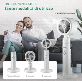 4 modalità di utilizzo: ventilatore da tavolo, da terra, nebulizzatore o umidificatore, perfetto per gli ambienti secchi;