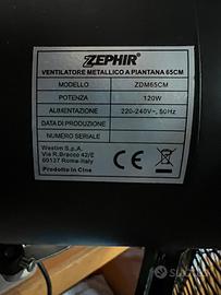 Ventilatore a piantana in metallo da 65 cm, marca ZEPHIR, modello ZDM65CM, colore nero, praticamente nuovo, utilizzabile sia in casa che all’esterno. Vendo per inutilizzo. Non spedisco, ritiro a mano.