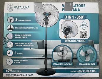 Ventilatore a piantana Ø40 cm (altezza circa 130 cm) • 3 velocità • Oscillazione • 3 pale in alluminio • Struttura in acciaio e ABS • Potenza 60W Perfettamente funzionante. Ideale per casa o ufficio.