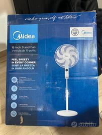 ventilatore midea silenzioso da 50w, altezza regolabile, 3 velocità, timer 7h, oscillazione 90° e telecomando. funziona perfettamente, usato pochissimo, aria molto forte e stabile.