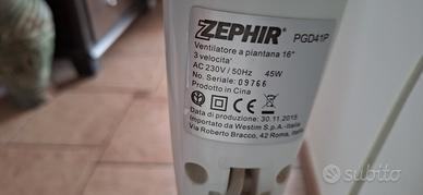 Ventilatore a piantana Zephir PGD41P (per informazioni tecniche consultare l'immagine con l'etichetta).