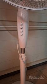 Ventilatore a piantana in colore bianco. Dotato di 3 velocità regolabili tramite pulsanti frontali e funzione oscillante, permette di distribuire l’aria in modo uniforme. L’altezza è regolabile.