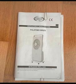 Ventilatore/Nebulizzatore Argo Polifemo Brizo. Come nuovo con telecomando e documenti. * Polifemo brizo è un ventilatore nebulizzatore che raffresca l'aria nebulizzando micro-particelle di acqua * Non richiede tubazioni aggiuntive e può essere utilizzato anche all'aperto; e' anche dotato di telecomando * Bocca di mandata centrale con rotazione a 360°: ottimizza il flusso d'aria in ambiente * 3 livelli di potenza selezionabili: alta, media e bassa 3 modalità di funzionamento (normal, natural, sleep) * Timer di spegnimento a step di 1 ora (1 - 8 ore) auto-spegnimento dell'unità dopo 15h di non funzionamento * Tanica interna da 3 l, facilmente rimovibile, per un uso continuativo ad alta velocità di almeno 8 ore