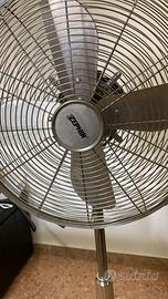 Ventilatore da pavimento in metallo cromato lucido, con base tonda anti ribaltamento e parabola inclinabile, oscllabile.