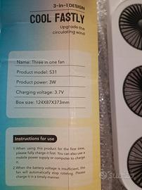 Vendo ventilatore Portatile da casa ufficio ecc.. Nuovo come da foto con potenza di 3 motori, ricaricabile tramite USB incluso e utilizzabile senza fili. Specifiche in foto. Zona di ritiro Viareggio