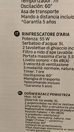 Acquistato due anni fa e usato pochissimo, vendo per inutilizzo. Raffreddatore d'aria portatile: raffredda, purifica e deumidifica, completo di telecomando e glassette - perfettamente funzionante - molto silenzioso - poco ingombrante e dotato di rotelle - ritiro a carico dell'acquirente. Imballaggio originale. Acquistato da Leroy Merlin ad €100,00.