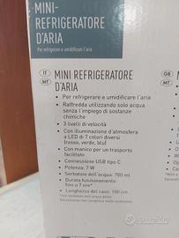 Vendo set da 4 mini refrigeratori di aria silver crest STLH 7 A1 come in foto perfettamente funzionanti con ognuno relativo connettore/ adattatore usb tipo c e potenza da 7 watt con ognuno libretto di istruzioni, ognuno in scatola originale, capacita serbatoio dell'acqua 700 ml, con illuminazione a led a 7 colori, con motore a 3 livelli di velocità⁷, usati solo una stagione estiva al mare, vendo per inutilizzo, opzionale vendo anche un 5° mini refrigeratore stesse caratteristiche di marca Enrico Coveri da trattare a parte. No perditempo