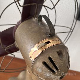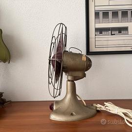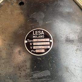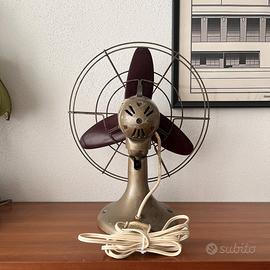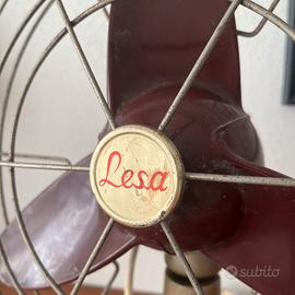 Ventilatore da parete vintage LESA Milano, modello ATP/2, anni 50. Corpo in alluminio pressofuso color champagne, pale in plastica bordeaux, griglia a filo metallico. Etichetta originale presente. Condizioni: dato come non funzionante, con patina d'epoca. Pale integre, griglia con ossidazione compatibile con l'età. Perfetto come oggetto decorativo in stile vintage/mid-century, anche solo come arredo. 🕰️ Esclusivamente ritiro a mano.