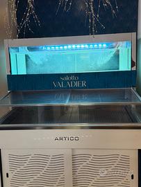 Vetrina espositiva bivalente con acquario per crostacei . Gruppo frigorifero monoblocco posizionato nel comparto tecnico sottostante. 150 larghezze x 1metro alto 180