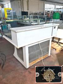 vetrina frigo carrellata per mercatini usata, si tratta di una vetrina refrigerata statica aperta dotata di ruote, piano esposizione in acciaio inox, piano lavoro in marmo/granito e motore a bordo utilizzata per l'esposizione di prodotti per ambulanti.