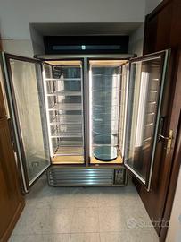 Vetrina con due ante una congelatore con 6 ripiani e una frigo con 6 ripiani di vetro rotanti .Entrambi gli spazi sono illuminati con 2 luci al neon e sono indipendenti uno dall'altro perché presenti due motori. Quindi possibile accedere solo il frigo o solo il congelatore oppure tutti e due insieme. Ideale per pasticceria e semifreddi e cibi che hanno bisogno di essere conservati al freddo ed elegantemente esposti. La vetrina è perfettamente funzionante e saprà dare un tocco retro' e vintage al vostro locale grazie alle linee morbide e al colore oro e marrone.