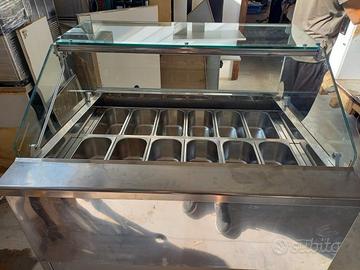 CIAO è la vetrina gelato professionale Plug-In. Teca vetri con serraggio meccanico, cappellotto superiore in vetro apribile con micro cerniere in acciaio lucidato, vetro frontale e fianchi riscaldati con sistema brevettato anti-appannamento, plafoniera in alluminio brillantato con binario integrato per scorrevoli in plexiglass a chiusura ermetica, illuminazione strip led no spot 3000°K. Refrigerazione ventilata con doppio flusso d'aria per la perfetta equalizzazione della temperatura del gelato. Vetro frontale e fianchi in vetro singolo riscaldato anti-condensa. Cappellotto in vetro apribile verso l'alto con micro-cerniere integrate alla plafoniera led no spot 3000 K. Le vetrine gelateria CIAO sono state concepite per avere prestazioni eccellenti ed altamente performanti, dispongono di motori ermetici con sbrinamenti ultrarapidi ad inversione di ciclo; la circolazione dell’aria avviene per mezzo di un doppio canale che assicura la perfetta distribuzione del freddo su tutte le vaschette. Le vasche sono monolitiche rivestite in acciaio. Questa vetrina è un modello da L1150 (12GUSTI) da incasso con possibilità di inserimento indipendente con predisposizione all'applicazione delle cove. Prezzo 2560,00 euro trattabili ritiro o spedizione organizzata e a carico dell'acquirente.