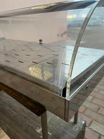 Vetrina/espositore dolci riscaldato in inox con base asportabile Dimensioni: 80x34 - H max interna 14 cm Doppia apertura Temperatura max 70º Leggermente scheggiata come di vede in foto Completa di cavo d’alimentazione