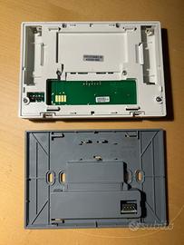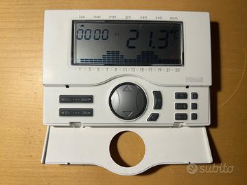 Cronotermostato elettronico per controllo ON/OFF della temperatura ambiente (riscaldamento e condizionamento), programmazione giornaliera/settimanale, uscita a relè in scambio 250 V~, alimentazione a batterie stilo AA LR6 1,5 V, installazione a parete, bianco. Perfettamente funzionante, a protezione dello schermo c'è ancora l'adesivo originale. Istruzioni di collegamento e montaggio, schede tecniche etc. sono reperibili sul sito del produttore.