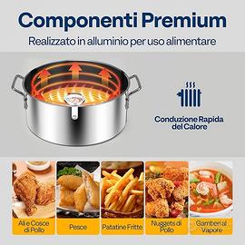 Costruzione Premium: Realizzata in alluminio per uso alimentare con finiture resistenti alle alte temperature, la nostra pentola per friggere è progettata per resistere all'uso quotidiano in diversi ambienti. La struttura in alluminio puro garantisce una conduzione del calore uniforme e veloce ed è facile da pulire, offrendo un'esperienza di cottura perfetta