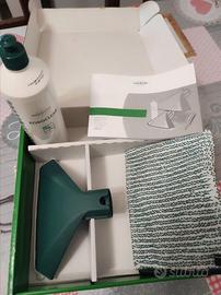 Questo kit comprende una bocchetta setolata, un guanto in microfibra, un flacone detergente Koboclear (formato da acqua, alcool e carbonato di calcio in polvere) da 750ml e il libretto di istruzioni multilingue. Tutti questi oggetti, in abbinamento al Folletto con tubo flessibile con attacco OV (elettrificato e non), permettono una efficace e duratura pulizia di vetri e finestre.