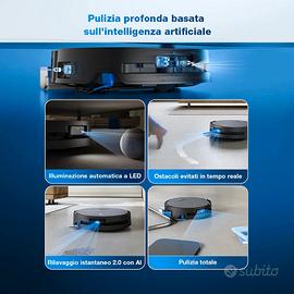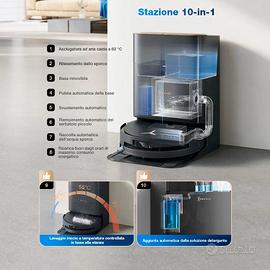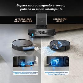 DEEBOT X9 PRO OMNI Energia di pulizia rivoluzionaria: combinazione definitiva di BLAST e OZMO ROLLER. garanzia attiva per 2 anni. BLAST (Tecnologia di aspirazione ad ampio flusso d'aria potenziata): raggiungere un flusso d'aria senza precedenti di 16,3 l/s e una potenza di aspirazione di 16.600 Pa, migliorando notevolmente le prestazioni di pulizia profonda, come evidenziato da un aumento del 137,6% nella velocità di rimozione della polvere dei tappeti. Tecnologia di pulizia automatica istantanea OZMO ROLLER: rimuove sporco e macchie con un'efficienza senza rivali. Rilevamento delle macchie tramite AI 2.0 & Sistema Triple Lift con separazione di precisione del lavaggio a secco-umido: garantire ovunque una pulizia precisa ed efficiente. Tecnologia anti-aggrovigliamento ZeroTangle 3.0: eliminare in modo efficace i grovigli di capelli. TruEdge 2.0 con Sensore perimetrale 3D: massimizzare la copertura perimetrale e degli angoli. Innovativa batteria a sacchetto EV-Grade: con una durata 2,4 volte superiore e una potenza notevole.