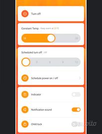 Cedo per inutilizzo Xiaomi Fan Heater S Nuovo. con WiFi per controllo e gestione da remoto di tutti i parametri. Descrizione dal sito Xiaomi: Potente e sicuro, il radiatore portatile Mi Smart Heater S assicura massima rapidità nel riscaldare gli ambienti con i suoi 2200 W di potenza, programmando fino a 6 livelli di temperatura. Per unire comfort e risparmio energetico, il convettore è dotato di un sistema di controllo intelligente della temperatura integrato. Il flusso d’aria erogato è più delicato di quello dei tradizionali convettori, a vantaggio del benessere di gola e occhi. Grazie all’ampia presa d’aria, la diffusione è ottimizzata e l’aria calda si irradia da più direzioni (dall’alto e sui lati). Ultra silenzioso, non interferisce con il riposo notturno. I due meccanismi di sicurezza attivano lo spegnimento immediato in caso di surriscaldamento o caduta accidentale. Controllabile tramite app Mi Home e assistente vocale per un utilizzo smart, essenziale nel design, leggero e facile da spostare, dispone anche di un pratico ripiano di asciugatura fino a 1,5 kg. Grazie al rivestimento impermeabile, assicura massima resistenza all’acqua IPX4.