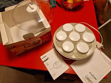 Completa di tutto : 7 vasetti con coperchio, istruzioni e scatola con confezione. Utilizzo molto semplice, yogurt buonissimo. Marchio Girmi.