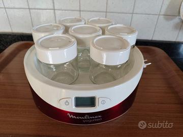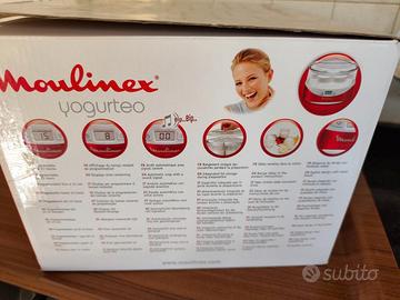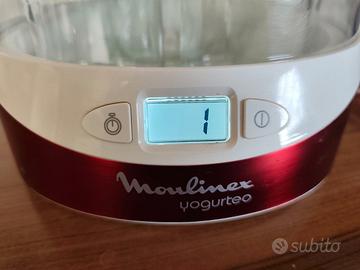 La yogurtiera Moulinex Yogurteo è un'apparecchio elettrico progettato per preparare yogurt in casa: permette di preparare in modo molto semplice fino a 7 vasetti di yogurt da 160ml ciascuno. I vasetti sono in vetro, riutilizzabili e lavabili in lavastoviglie. Dotata di timer digitale programmabile fino a 15 ore, con spegnimento automatico. Apparecchio in ottimo stato, sono un po' rovinate il libretto di istruzioni e la scatola ( vedi ultima foto)