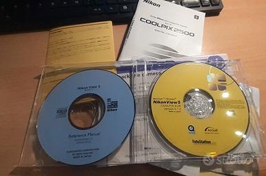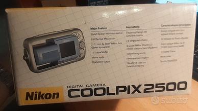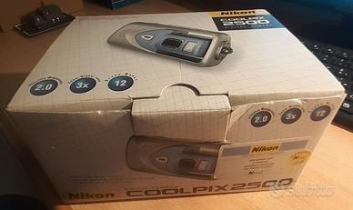 2 Fotocamere Nikon Coolpix 2500 non funzionanti, batterie, caricabatterie e schede memoria assenti. 1 confezione originale con manuali e CD di installazione. Buone per ricambi.