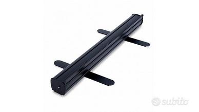 2 Roll Up Standard nero per il formato 85 x 200 cm con rinforzo della parete posteriore mediante palo stabilizzatore. Grazie al montaggio rapido e al facile trasporto è ideale per l'utilizzo in fiere, sale vendita o presentazioni.