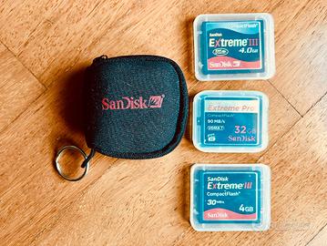 3 Compact Flash CF cards (40GB totali), usate pochissimo (ca 1500 scatti in totale), con contenitori e astuccio SanDisk originali: 1x32GB SanDisk Extreme Pro - 90MB/s 1x4GB SanDisk Extreme III - 30 MB/s 1x4GB SanDisk Extreme III - 20 MB/s (ESP technology)