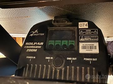 Macchine utilizzate pochissime volte, cedo per inutilizzo. Complete di accessori e alimentazione originali. Il prezzo comprende tutte e tre le macchine ed è leggermente trattabile, vendita solo in blocco. Astenersi perdi tempo. CARATTERISTICHE PRINCIPALI: * Angolo di proiezione: Zoom da 15° a 40° * Possibilità cromatiche infinite * Dimmer lineare 0-100% * Strobo regolabile * Macro colori richiamabili da DMX * 4 configurazioni DMX disponibili: 3/5/7/9 canali * Key lock password per blocco impostazioni display * Modalità Master/Slave selezionabile * Modalità Macro con la possibilità di richiamare da display 63 programmi * Modalità Play/Edit User con la possibilità di eseguire ed editare fino a 20 programmi temporizzati * 5 curve dimmer * Struttura in alluminio pressofuso * Display LCD grafico di colore azzurro * Pulsanti soft touch * Vetro temperato frontale * Posizionamento “light up” senza l’utilizzo delle staffe * Dimensioni: 280 x 300 x 280 mm * Peso netto: 5.5 Kg