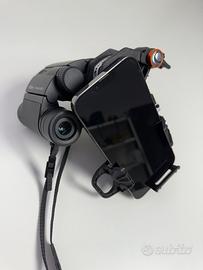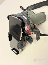 L’adattatore con 3 pomelli di regolazione direzionale singole e precise degli assi X, Y e Z, consentono l’allineamento accuratissimo tra la fotocamera del telefono e l’oculare dell’ottica. L’adattatore può essere installato su qualsiasi oculare, da diametro 30mm a 60mm, mediante due anelli adattatori inclusi. Sistema di tenuta-presa con sicurezza e bloccaggio.