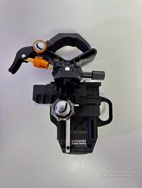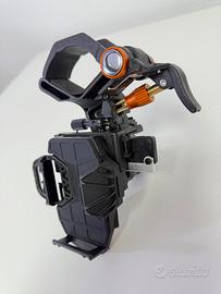 Costruzione robusta con una struttura metallica e un corpo polimerico. Accoglie una vasta gamma di smartphone ((iPhone 16 Pro Max nelle fotografie) assicurandoli mediante alloggiamento auto centrante.