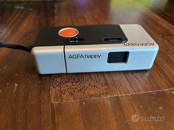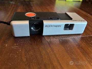 Camera fotografica Agfa Happy pocket anno 82/83 in confezione originale, usata pochissimo, con rotolo di pellicola Agfacolor 100 (12 fotografie) scaduto a 03/84. Con istruzioni originale. La cover della confezione essendo in plastica è diventata un po’ scura.